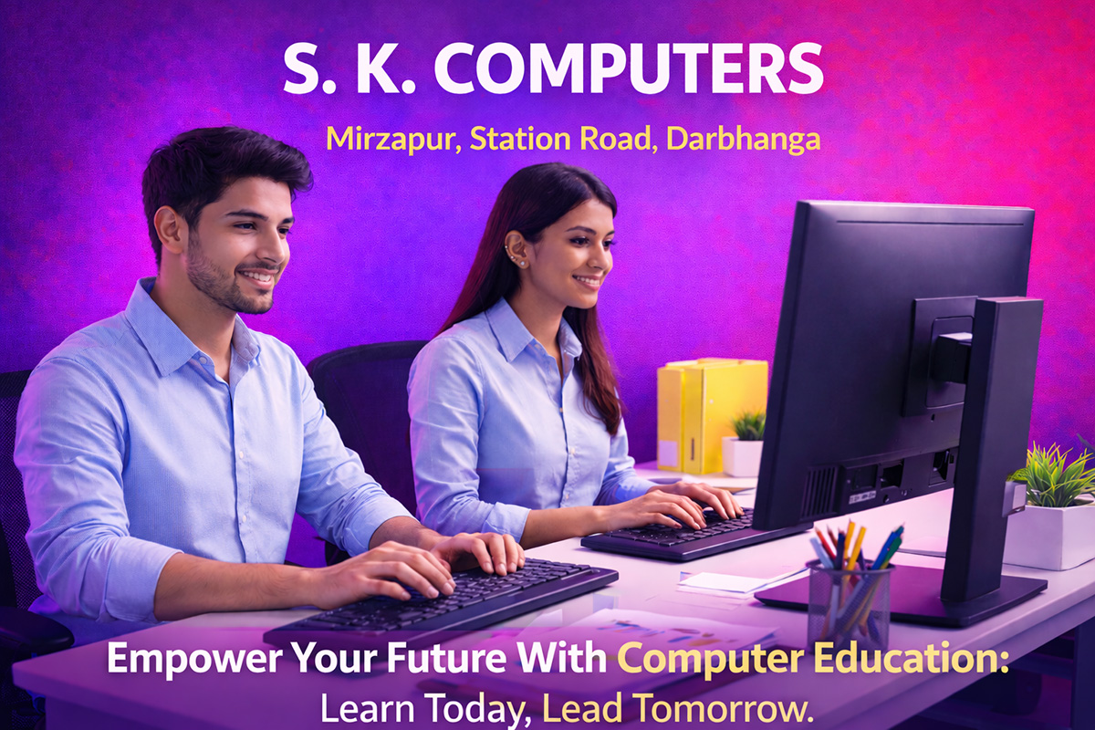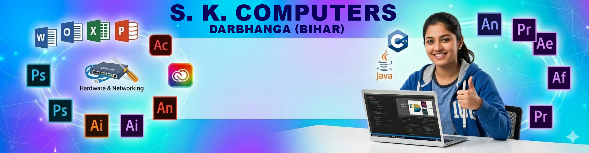 S. K. COMPUTERS दरभंगा, बिहार में स्थित एक प्रतिष्ठित कंप्यूटर प्रशिक्षण संस्थान है। वर्ष 1993 से हम DCA, ADCA, Tally, Graphic Design जैसे विभिन्न कंप्यूटर कोर्स में गुणवत्तापूर्ण शिक्षा प्रदान कर रहे हैं।